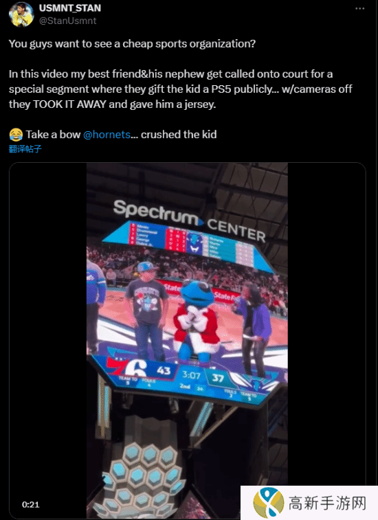 据外媒报道,日前,NBA夏洛特黄蜂队与费城76人比赛中发生了争议事件。当事人爆料,在比赛特别环节,黄蜂队送给了自己侄子一台PS5游戏机,然而这只是逢场作戏,直播镜头一转,这台PS5又被黄蜂队收回了,