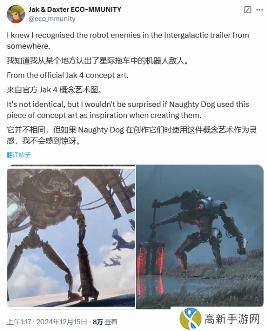 在TGA 2024颁奖典礼上,顽皮狗正式公布了旗下新作《星际:异端先知》,预告片也一并放出。在预告片的末尾,出现了一只机器人,推主@eco_mmunity将其与顽皮狗此前已取消的作品《Jak 4》概
