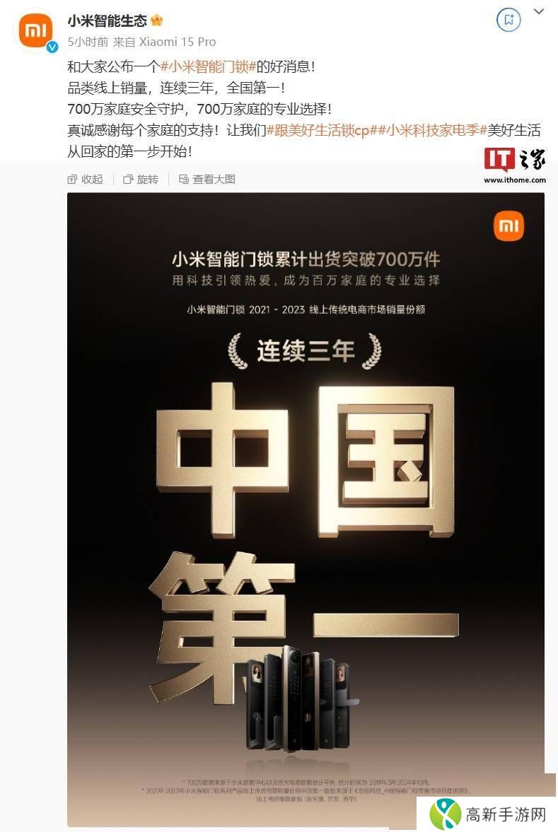 小米智能门锁出货量破700万,连续三年全国线上销量领先!