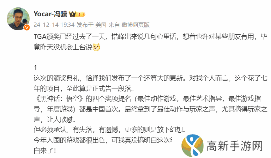 TGA2024颁奖典礼正式结束。《宇宙机器人》获年度最佳游戏!《黑神话:悟空》遗憾落选。TGA奖项是否符合你心意?点击这里打分锐评!>>>而就在今晚,《黑神话:悟空》主创冯骥在微博发布长文,对本次T