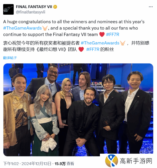 TGA 2024颁奖典礼现已正式结束,《最终幻想7》官推发布了一条推文,表示:“热烈祝贺今年TGA的所有获奖者和提名者,并特别感谢所有继续支持《最终幻想7》团队的粉丝。”并晒出了一张参会团队合照。在