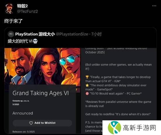 《Grand Taking Ages VI》获PC Gamer满分好评,GTA6真的要来了?