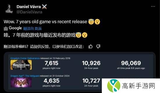 日前,我们曾报道,Warhorse Studios的联合创始人兼《天国:拯救》制作人Daniel Vavra发了一张《天国:拯救》和《龙腾世纪4》Steam同时在线人数的对比图,并配文“哇~七年前的