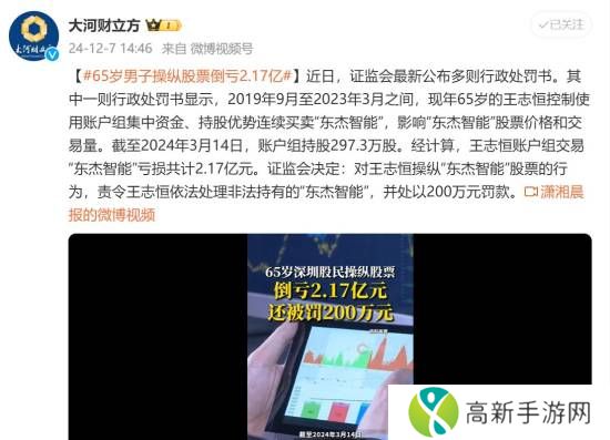 12月7日消息,证监会近日披露一则行政处罚决定书,现年65岁的王志恒因操纵东杰智能科技集团股份有限公司(以下简称东杰智能)股票,被处罚款200万元。经查,王志恒于2019年9