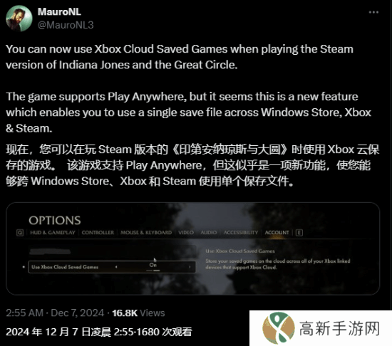 《夺宝奇兵:古老之圈》现已开启高级版抢先游玩,12月9日正式发售。有玩家在Steam版上发现了一个特殊功能。玩家发现,该作的Steam版本也支持Xbox云存档,也就是该作的主机版本和Steam版本存