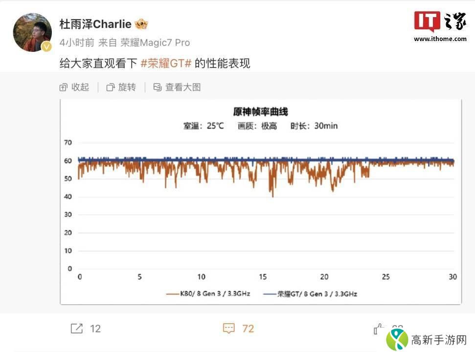 荣耀GT搭载骁龙8 Gen3,《原神》帧率图曝光性能强劲