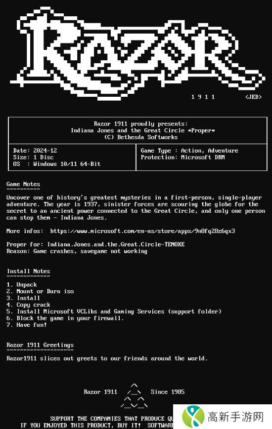 近日,博主@Pirat_Nation发文称,《夺宝奇兵:古老之圈》已经被破解,并展示了一张Razor1911破解组的图片。这一消息引发了玩家和业内人士的关注。然而,值得注意的是,贝塞斯达官方已经在此