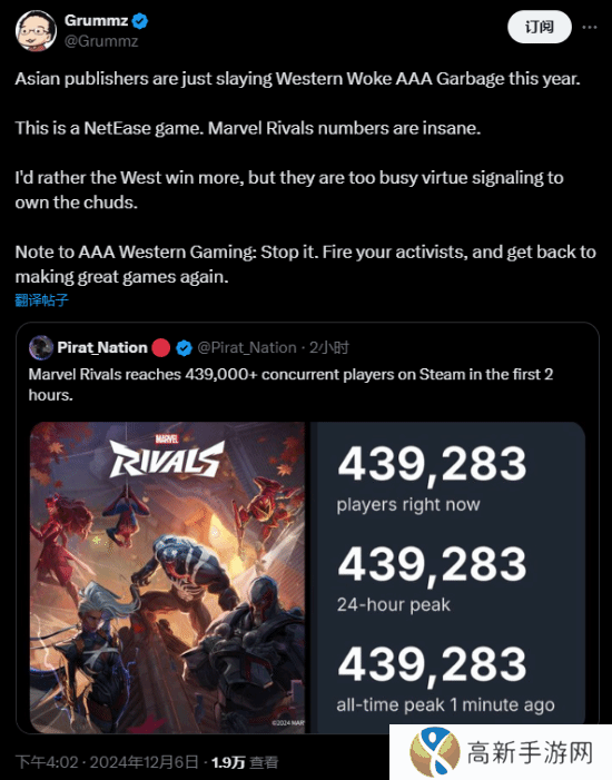 网易游戏《漫威争锋》现已全面上线,虽然这是一款免费游戏,但Steam同时在线人数峰值达到444,286这一数字也足以令人印象深刻。《漫威争锋》火爆的热度也吸引了不少国外玩家的关注。前暴雪制作人Mar