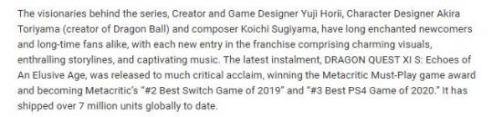 在今日公布《勇者斗恶龙3 HD-2D重制版》销量的新闻稿中,Square Enix在文章末尾也透露了《勇者斗恶龙11》的销量。目前DQ11系列(含11S)的全球总销量已突破700万份!SE上次公布《
