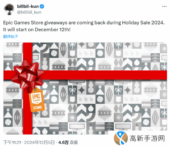 知名爆料人Billbil-kun提醒玩家,Epic在今年冬促期间会继续向玩家们赠送游戏,冬促时间将在12月12日开始。在评论区里,仍有很多玩家念念不忘Epic的优惠券。本周的Epic免费游戏为《