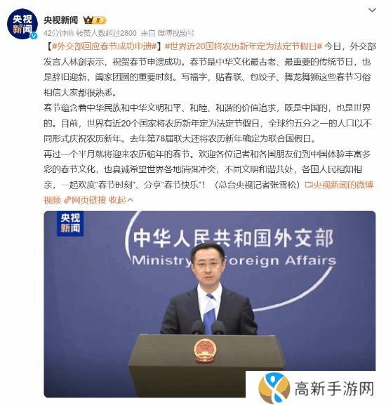据央视新闻报道,今日,外交部发言人林剑表示,祝贺春节申遗成功。春节是中华文化最古老、最重要的传统节日,也是辞旧迎新,阖家团圆的重要时刻。写福字,贴春联、包饺子、舞龙舞狮这些春节习俗相