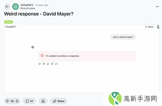 根据快科技的报道,近日聊天机器人ChatGPT在面对一个名字时出现了奇怪的故障,无论用户如何尝试,都无法让ChatGPT说出“David Mayer”这个名字。不管用户怎么修