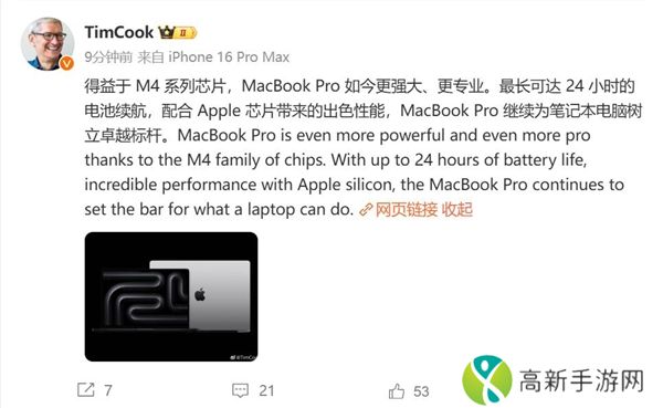 苹果CEO库克:MacBook Pro为笔记本行业树立了标杆